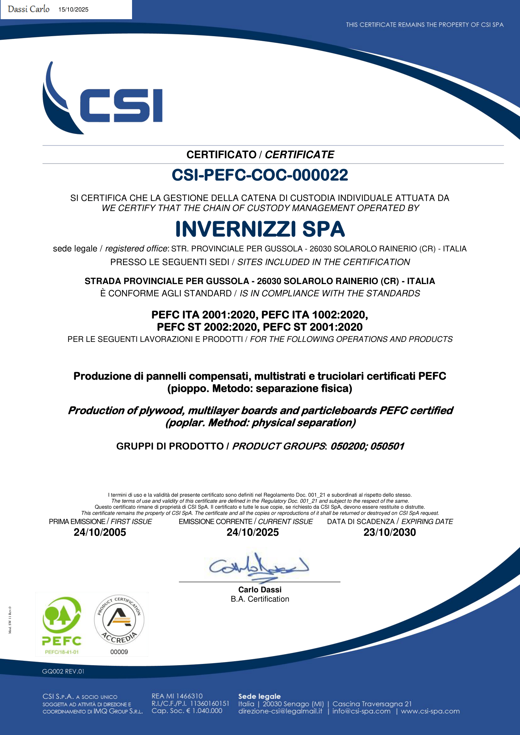 COC PEFC: witnessing an extreme care and respect for the environment in 2005 Invernizzi spa certified the company’s Chain of Custody (COC) under terms of the international PEFC international environment protection standards.